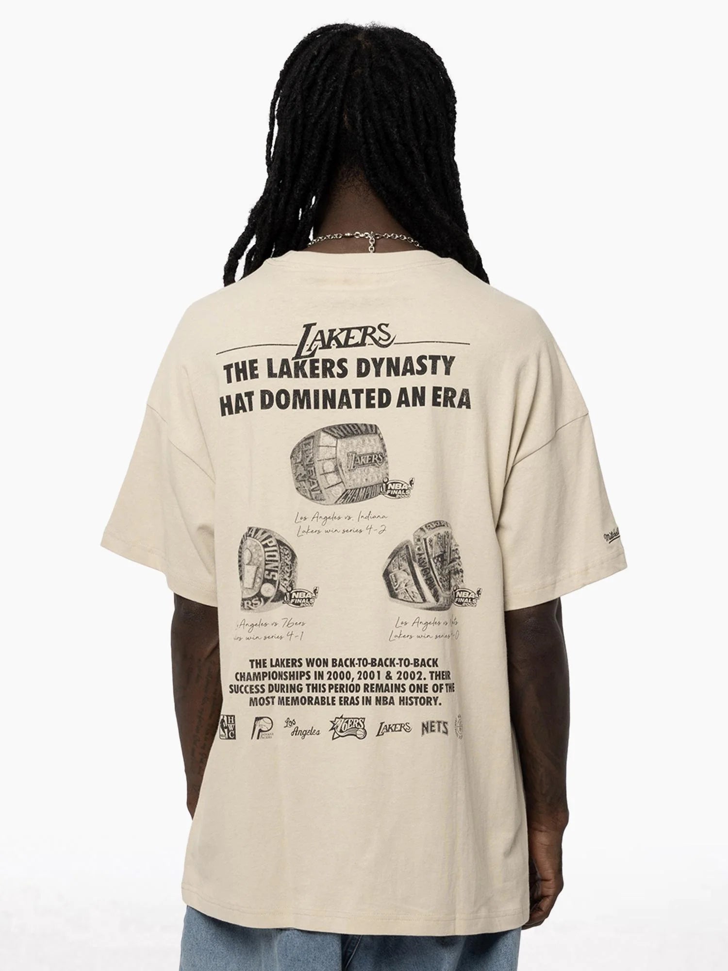 Celebrate purple and gold greatness with the latest Los Angeles Lakers Signature Dynasty Tee. Built in an oversized Homage fit, it features a vintage enzyme wash, digital print with light distressing, and detailed back graphics honouring the Lakers’ championship legacy. Finished with an embroidered Mitchell & Ness logo on the sleeve and crafted from 100% cotton—perfect for die-hard Lakers fans. The greatness that is the Los Angeles Lakers franchise started '46 as the Detroit Gems. In '47, the team shifted to Minneapolis and became the Minneapolis Lakers from the state nickname, "land of 10,000 lakes." The Lakers relocated to Los Angeles before the '60-'61 season.